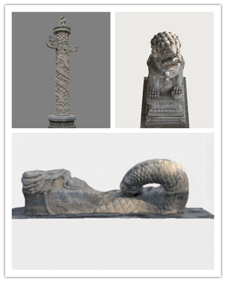 图3 华表、石狮子、翻尾石鱼的三维模型